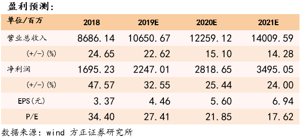 盈利预测与评级:预计19-21年EPS为4.46/5.60/6.94元,对应PE27/22/18倍,维持“强烈推荐”评级。