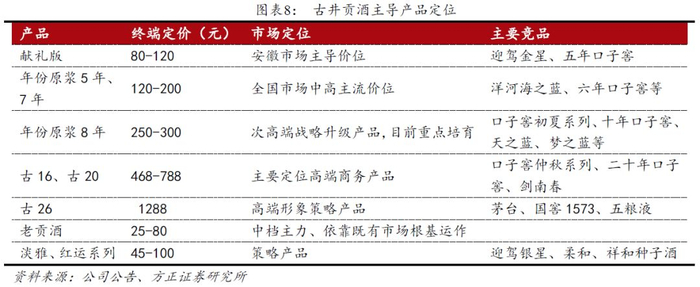 定位准确,树立中高价位主导产品,主攻最主流市场:古井采取与洋河类似的“产品创新+中高端定位+重营销”的战略,成功搭上了名酒复苏的末班车。2008年,公司树立以年份原浆为核心的主导产品系列,终端定价98-468元,分为献礼版原浆、五年原浆、八年原浆、十六年原浆,后又推出26年原浆,终端定价1288元。主导产品的确立针对主流市场价格带,在成熟领域通过挤压式和扩容式的增长来提升销售额。年份原浆自08年推出,即取得了超常规的成长业绩,在销售结构中占比不断提高,带动利润大幅增长。截止2019年底,公司“年份原浆”系列营收占比达85%左右,其中古8及以上占比超过25%。