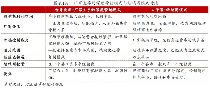 从模式上看,古井的营销模式是强调以厂家为主导的“深度营销”模式,公司掌控市场的运作,并主导费用的投放和终端推广。与古井相反,口子窖目前采用的是经销商代理模式,市场运作更依赖于经销商,其市场费用投放也主要由经销商承担。两种模式各有千秋,口子窖的渠道管理模式更加灵活,成长稳健;古井运作偏狼性,主导市场和价位升级效率较高。因此,在不同经营模式下都会有非常优秀的公司。