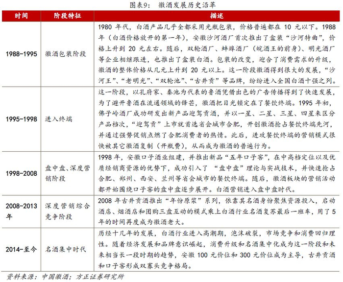 激烈的渠道竞争为徽酒塑造安全壁垒。白酒行业素有“东不入皖,西不入川”之说,充分展示了徽酒激烈的竞争状态以及本地市场的强势地位。从历史发展脉络看,安徽酒企基本引领了中国整个白酒行业营销模式的变革和创新,在渠道建设与经营能力方面均有巨大优势,在徽酒带动下,整个白酒行业的营销观念发生了根本性变化,营销重点从以往粗放的流通渠道逐步转向精细化要求更高的终端餐饮和大卖场,企业的销售能力和市场运作能力大大提升。诸多区域强势品牌以及中高端白酒企业正是通过密不透风的终端营销术(渠道拦截等)实现了对本地市场和区域市场的强势控制,完成了对外来品牌的阻击,从而逐步形成今天白酒产业传统名酒阵营和地产强势品牌平分天下的竞争格局,仅在安徽经营了十几年的洋河有一部分市场份额。