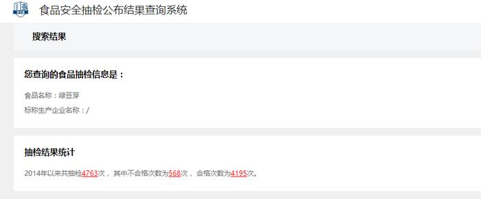 事实上,豆芽使用植物生产调节剂并不是个例。新京报记者通过搜索国家市场监管总局食品安全抽检公布结果查询系统后获知,据不完全统计,自2014年起,截至2019年12月9日,抽检的4763批次绿豆芽中,不合格批次达568。而不合格的原因大多为抽检出禁用的6-苄基腺嘌呤(6-BA)、4-氯苯氧乙酸钠(以4-氯苯氧乙酸计)等植物生长调节剂。