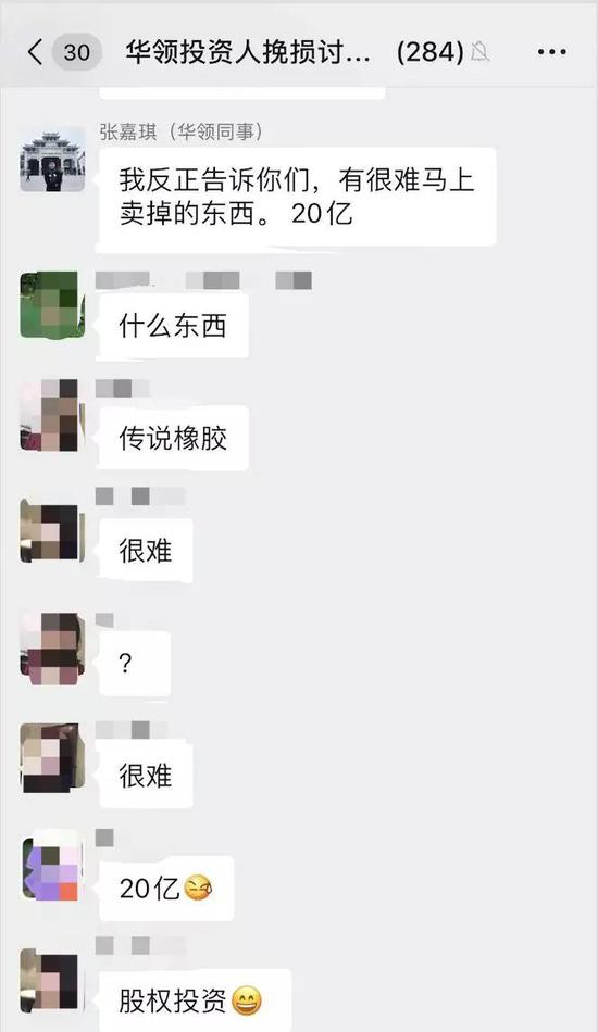 王伟向时间财经出示了一张华领投资人微信群的聊天截图,一位疑似华领工作人员在群中表示,“有很难马上卖掉的东西,价值20亿”。王伟表示,这个工作人员口中价值20亿的就是上述的劣质资产。
