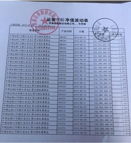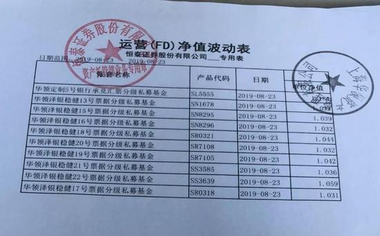 王伟向时间财经展示了两张今年8月恒泰证券出具的基金净值变动表,“上面盖了恒泰和华领的印章,显示截至今年8月23日两只基金的净值仍在1以上,也就是说基金资产仍是正的,比如1.07就是净赚7%”。
