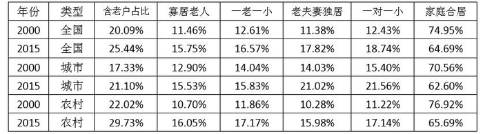根据普查数据,在有65岁及以上老人的家庭户中,2000年以来,老人与劳动年龄的家庭成员合居的比重从2000年的74.95%持续降低到2015年的64.69%,一个老人或老夫妻独居的比重则持续上升,由于计划生育和城镇双职工家庭的兴起,年轻夫妻需要老人照看孩子,因此城市和镇的寡居老人比重在2015年略有降低,但老人独居的趋势未改(参见表3)。