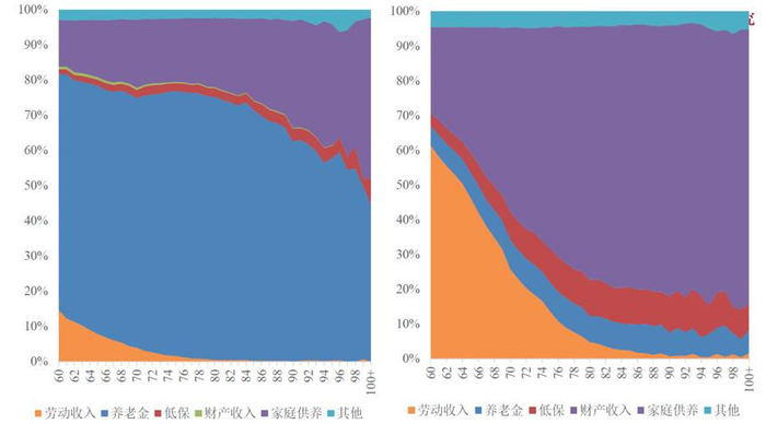 图4:分年龄的城市老人和农村老人的收入来源(2015)。资料来源:2015年的全国1%人口抽样调查数据。本图为比率的面积图,左图为城市老人,右图为农村老人,横轴为年龄。