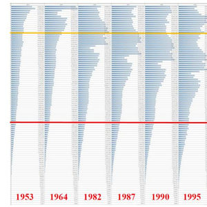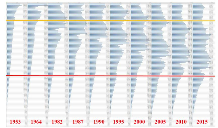 图1:中国人口年龄结构动态。资料来源:笔者自制,历年全国人口普查和1%人口抽样调查。橙线以上为0-14周岁,红色以下为60周岁及以上。