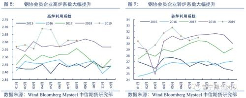 首先,在近几年高利润的刺激下,钢厂加大技术改造力度,在产产能的生产效率大幅提高,使得在产产能出现了实质性扩张。根据中钢协的数据,2019年1-8月,会员钢企高炉利用系数平均为2.608,最高为4月的2.688,这一数据在2014年至2017年平均为2.461,增幅达到5.97%。会员钢企转炉利用系数平均为30.727,最高为5月的32.641,而2014年至2017年平均为27.492,增幅高达11.77%。