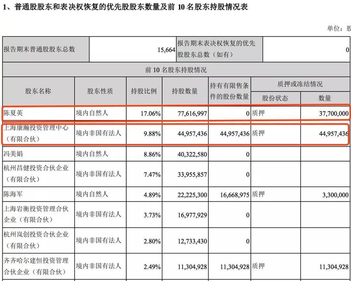 时间财经查阅创新医疗2019年三季报发现,公司实际控制人、第一大股东为陈夏英,持股比例为17.06%,质押比例为48.57%。第二大股东康瀚投资持股4495.74万股,比例为9.88%,股票全被质押。陈海军持有创新医疗总股本的4.89%,系公司董事长,陈夏英、陈海军系姐弟关系,二者存在关联关系。