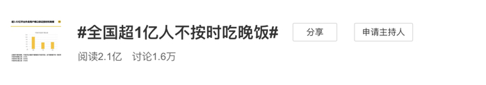 近日,微博话题#全国超1亿人不按时吃晚饭#登上热搜,网友们纷纷发表自己的意见和看法,多数人表示,不仅是晚饭,早饭和中饭同样无法按时吃。
