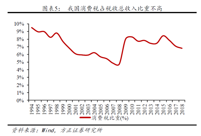 中国消费税收入快速增长,且发生过多次调整,但未发生重塑。国内消费税收入由1994年的487.4亿元增至2018年的10,632亿元,CAGR为13.7%。自1994年以来,我国多次对消费税进行调整,不同时期、不同经济背景下,征税范围和税率的变化反映消费税限制或促进消费的政策导向变化。但其所涉及的税目、税率和征税环节均为局部调整,并未有根本性或整体性的重大变革。