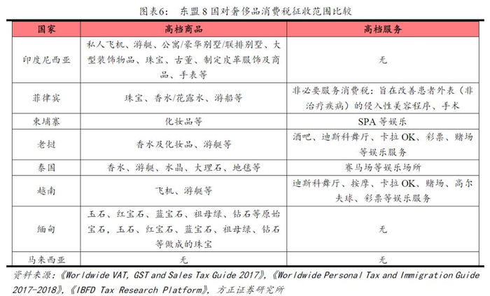 许多国家除了对高档商品征收消费税外,对于高档服务消费等奢侈行为和场所亦征收特别消费税。例如,东盟8国中5个国家将高档服务纳入消费税的征税范围,基本以娱乐服务为主;韩国对奢侈品消费税的征收范围包括33种产品和7种场所,涉及奢侈性活动和场所,如赛马场、滑雪场、蒸汽浴室、夜总会等等;我国台湾地区对高尔夫球场、歌厅、舞厅等高档消费场所在增值税的基础上,单独征收高税率的娱乐税(作用等同于特别消费税)。