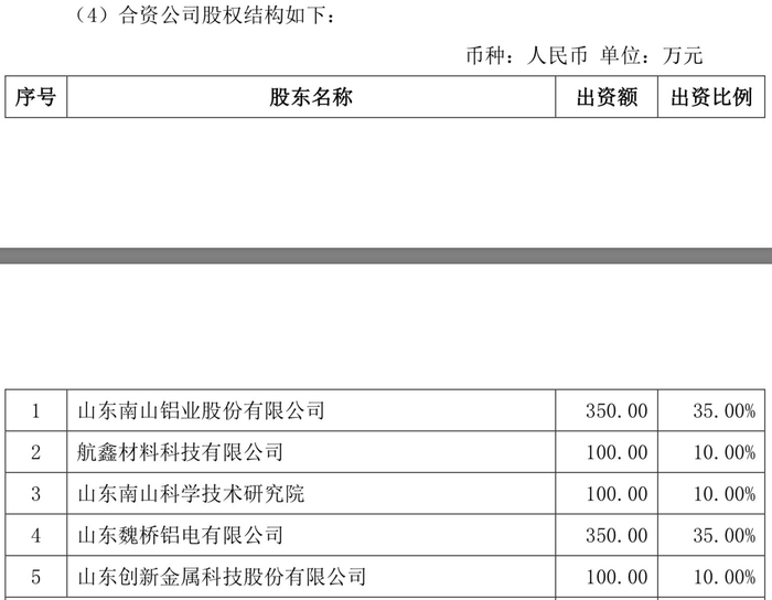 上市公司南山铝业12月3日公告,公司及子公司航鑫材料科技有限公司(以下简称“航鑫材料”)、山东南山科学技术研究院(以下简称“南山研究院”)与山东魏桥铝电有限公司(以下简称“魏桥铝电”)、山东创新金属科技股份有限公司(以下简称“创新金属”)共同出资设立山东智铝高性能合金材料有限公司(以下简称“合资公司”),注册资本1000万元。