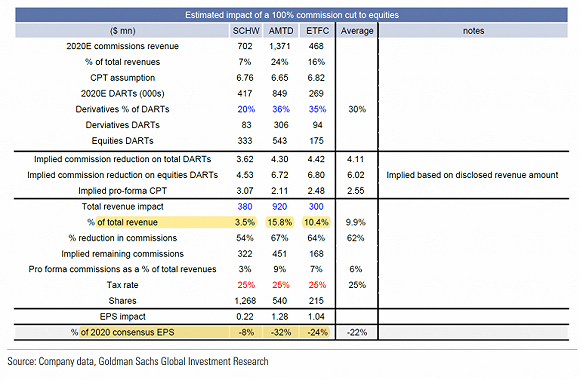 E*Trade表示,零佣金将使其季度收入减少7500万美元。嘉信理财首席财务长Peter Crawford则预计,这一变化将减少销售额约9000万至1亿美元,TD Ameritrade也估算,每季度将减少收入的15%至16%,约为2.2亿至2.4亿美元。