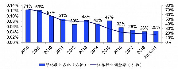 从证券业协会数据来看,2008年行业平均佣金率为0.126%,2013年下降到0.081%,2019年中期,又迅速下降至0.031%。经纪收入占比也随之大幅下滑,由2008年的71%下降至2019年上半年的25%。