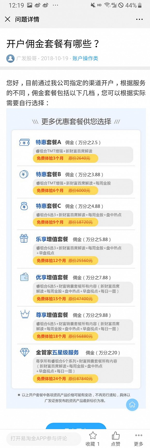 而在不少券商在客户端及网页的开户页面上,也的确如上述负责人所说,写着“开户佣金万2.5起”,并根据服务的不同,提供不同的佣金套餐供客户选择。