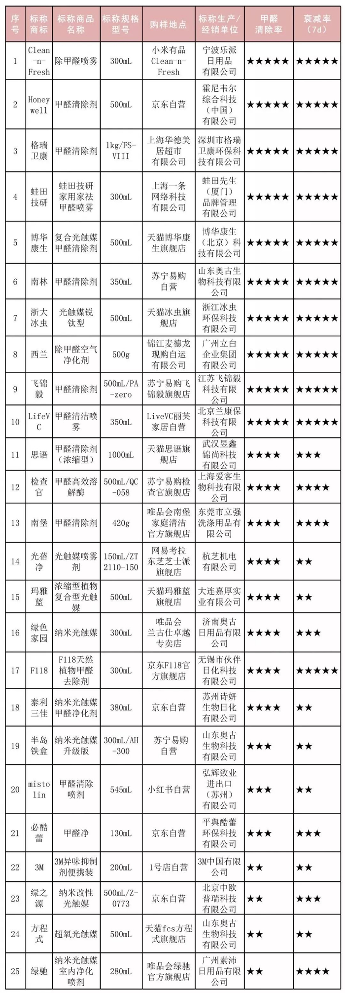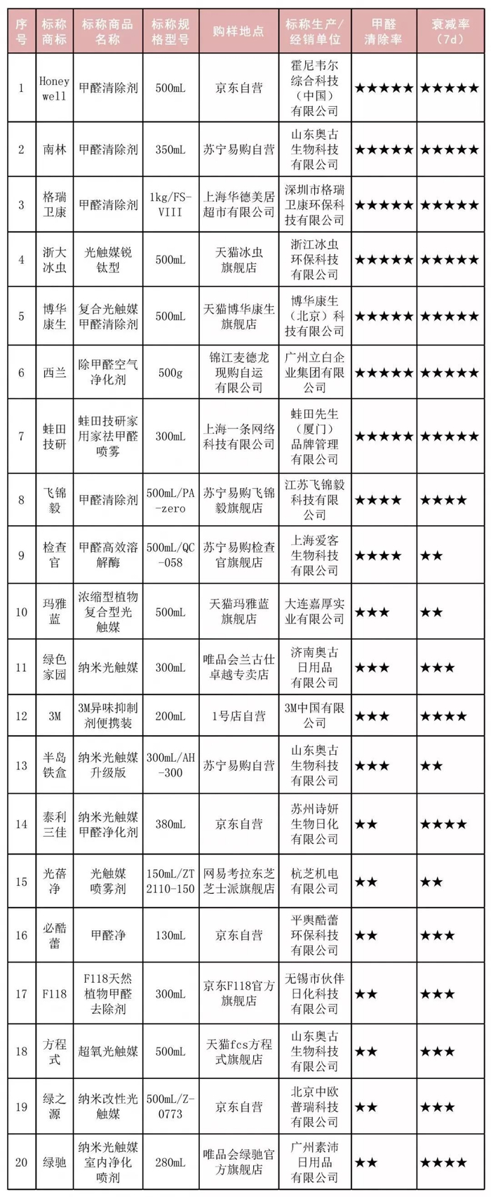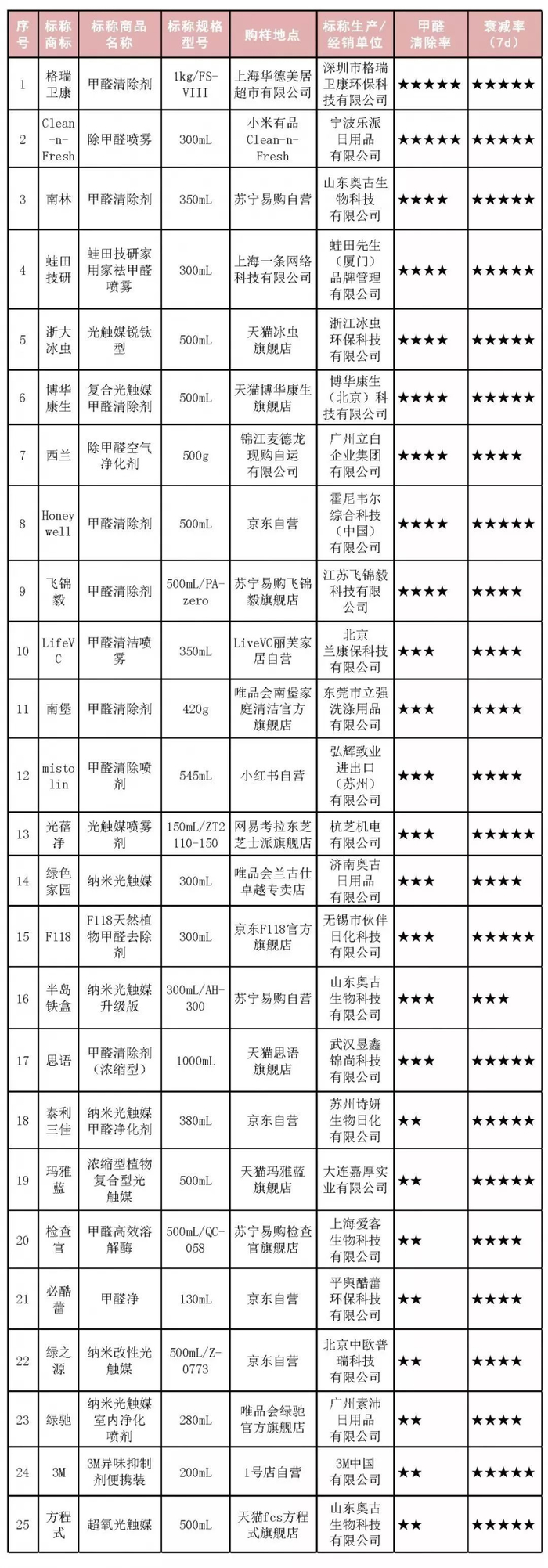 注1:甲醛清除率评分标准:5星:甲醛清除率≥75%;4星:50%≤甲醛清除率<75%;3星:25%≤甲醛清除率<50%;2星:甲醛清除率<25%。