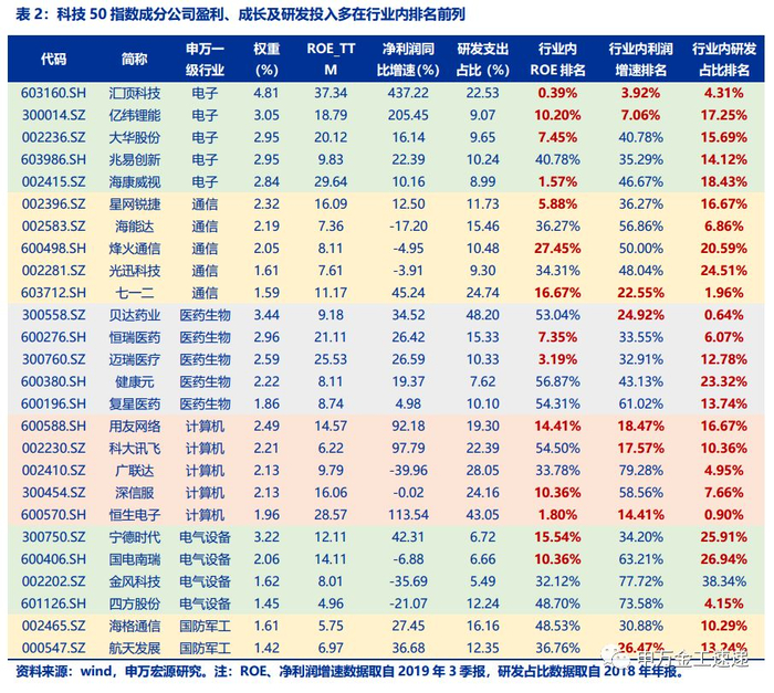 区别于传统行业,科技行业高研发投入、高研发产出的特征,使得其技术壁垒相对较高,龙头效应较为明显。根据刚刚披露完成的A股上市公司2019年三季报数据,我们筛选中证科技50指数主要覆盖的电子、通信、医药生物、计算机、电气设备和国防军工六个高科技相关行业中的代表性公司(筛选标准为科技50指数成分股中各行业权重前五的公司。科技龙头指数编制规则请参考下文指数分析部分),从公司盈利能力、成长能力以及研发支出占营业收入比例(取自2018年年报数据)等维度来看,强者恒强的特征明显。科技50指数成分公司研发强度多排在行业前列,为其未来成长空间提供研发保障,同时多数公司的盈利能力、成长能力也在行业内前30%分位。
