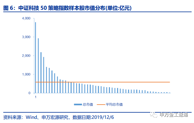 中证科技50策略指数样本股的市值分布范围较广,在30亿元-3900亿元之间;但从总体来看,指数内多数样本的市值较高,截止2019/12/6,指数内市值超过100亿元的股票有41只、超过1000亿元的股票有7只;全部样本平均总市值为586亿元,总市值中位数为354亿元,因此中证科技50策略指数整体偏向大中盘市值风格。