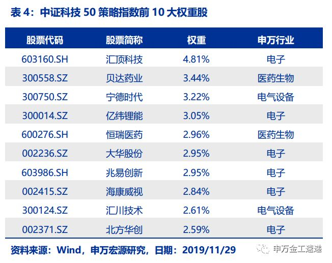中证科技50策略指数前10大权重股中,电子行业股票数量达到了6只,另有2只医药生物股票、2只电气设备股票。指数前10大权重股分别为汇顶科技、贝达药业、宁德时代、亿纬锂能、恒瑞医药、大华股份、兆易创新、海康威视、汇川技术、北方华创,权重分别为4.81%、3.44%、3.22%、3.05%、2.96%、2.95%、2.95%、2.84%、2.61%、2.59%,合计为31.42%。