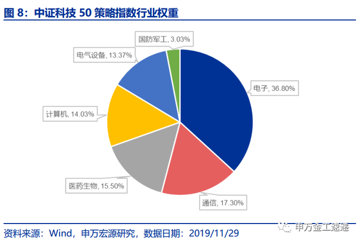 中证科技50策略指数的行业主要聚焦于信息技术、高端制造等科技行业,根据申万行业分类,指数供覆盖电子、通信、医药生物、计算机、电气设备、国防军工,权重分别为36.80%、17.30%、15.50%、14.03%、13.37%、3.03%。