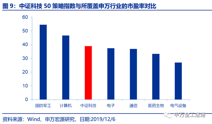 截止2019/12/6,中证科技50策略指数市盈率为39倍,虽然与市场基准指数相比,指数估值水平较高,但这也与指数的高科技行业特征相关。中证科技50策略指数所覆盖的6个行业相对市场均有较高估值溢价,与6个行业相比,中证科技50策略指数的市盈率处于中等水平。