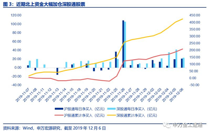 北上资金自11月以来继续大幅净流入,其中,深股通流入速度明显超过沪股通,截至12月6日,最近一个月以来沪股通累计净流入209.50亿元,而同期深股通净流入达425.15亿元,是沪股通的两倍。从行业分布来看,最近一个月北上资金集中加仓电子、计算机等高科技行业,减持大消费和大金融板块。