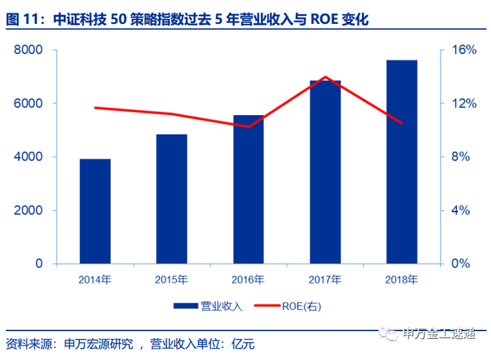 中证科技50策略指数成长性高,2014-2018年报,指数样本股的营收规模持续增长,最新营业收入合计达到7606亿元,复合增长率为18%。指数样本股的盈利能力也持续稳定,2014-2018年报,指数净资产收益率均保持在10%以上。