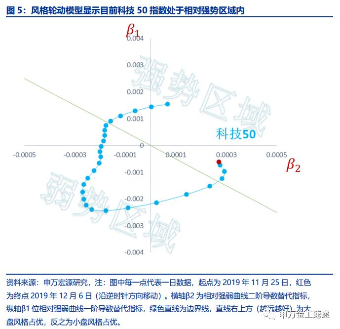 此外,从中短期风格轮动角度来看,当前市场风格也与科技50指数风格较为契合。我们基于申万金工风格轮动模型,将上证50指数与科技50指数作为一组相对立的风格指数来观察,通过计算科技50指数相对于上证50指数的相对强弱曲线,及其一阶导数与二阶导数,来确定各风格板块的强弱状态。如下图所示,目前的相对强弱曲线已进入科技50指数相对强势区域,中短期内科技50指数或将继续领先市场。