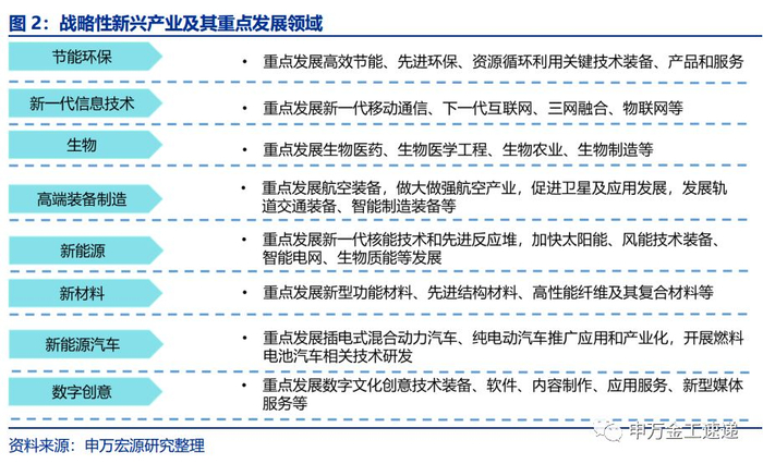2010年10月,国务院印发《关于加快培育和发展战略性新兴产业的决定》,确定节能环保、新一代信息技术、生物产业、高端装备制造、新能源、新材料和新能源汽车为七大战略性新兴产业。《决定》提出用20年时间使得战略性新兴产业的整体创新能力和产业发展水平达到世界先进水平,为经济社会可持续发展提供强有力的支撑。