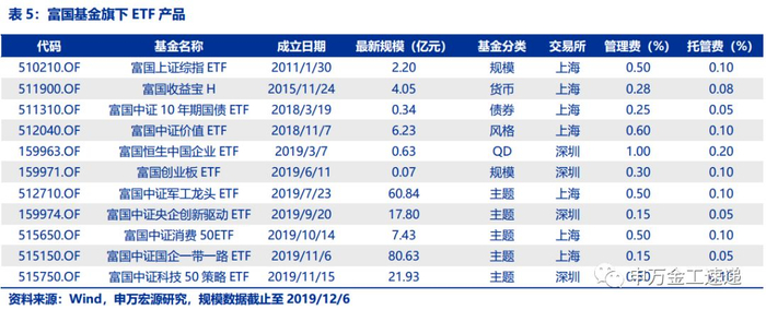 富国基金管理有限公司成立于1999年4月13日,是经中国证监会批准成立的首批全国性基金管理公司之一。富国基金在指数管理方面经验丰富,2011年起成立富国上证综指ETF,今年起在ETF领域开始发力。截止2019年12月6日,现有9只股票ETF、1只债券ETF、1只货币ETF,管理总规模为202.14亿元,其中股票ETF的管理规模为197.75亿元。