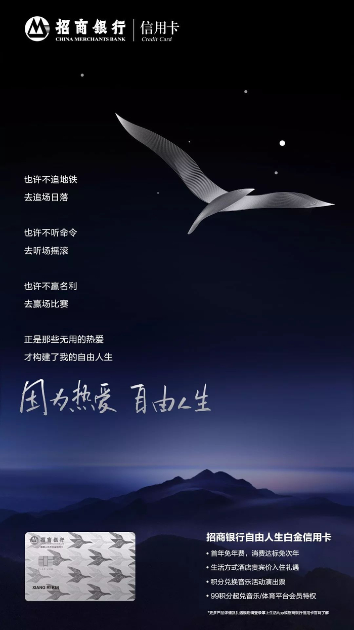 “愿我们的自由人生白金信用卡让年轻人拥抱他们的热爱,也希望我们的自由人生白金信用卡陪伴更多的年轻人,享受他们的自由人生。”招商银行自由人生白金信用卡产品经理表示。