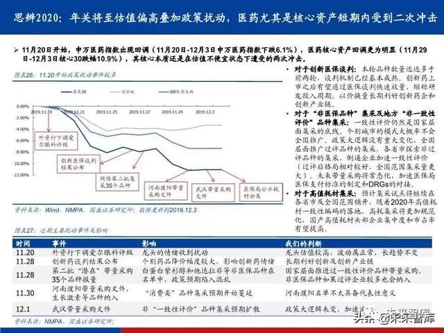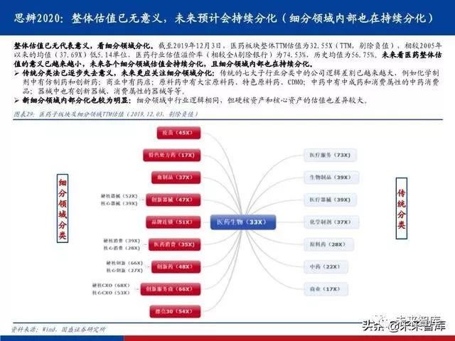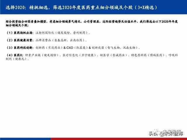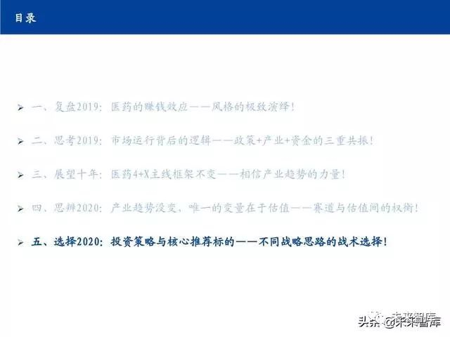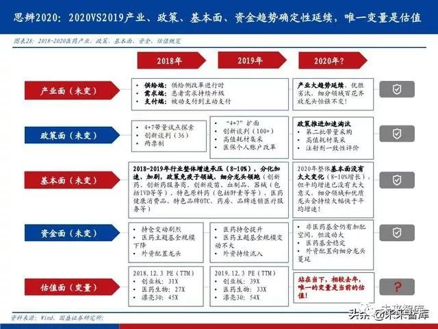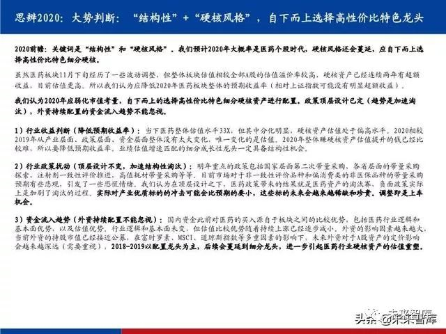 从产业面、政策面、基本面、资金面、估值面等五大维度来看,2020年真正发生变化的仅有估值。我们认为,2020年的关键词是“结构性”和“硬核风 格”,预计2020年大概率是医药个股时代,硬核风格还会蔓延,应自下而上选择高性价比特色细分硬核,弱化市值考量,自下而上的选择高性价比特色细 分硬核资产进行配置。