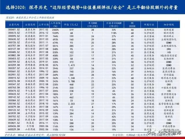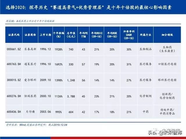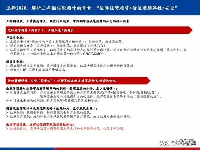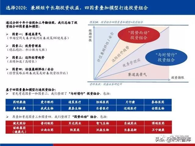 通过分析十年十倍股和三年翻倍股,我们总结了投资组合四因素叠加模型:赛道高景气、优秀管理层、边际经营趋势、估值兼顾弹性/安全。首先考虑因 素一与因素二,我们整理了“与时偕行”组合,再叠加考虑因素三和因素四,我们整理了“因势而动”组合: “与时偕行”:药明康德、爱尔眼科、通策医疗、恒瑞医药、片仔癀、泰格医药、美年健康、我武生物、康泰生物、乐普医疗、迈瑞医疗、安图生物。“因势而动”:健友股份、普利制药贝达药业、智飞生物、东诚药业、博瑞医药、丽珠集团(健康元)、云南白药、凯莱英、沃森生物、长春高新、卫 宁健康。