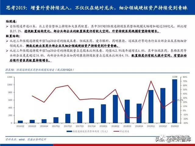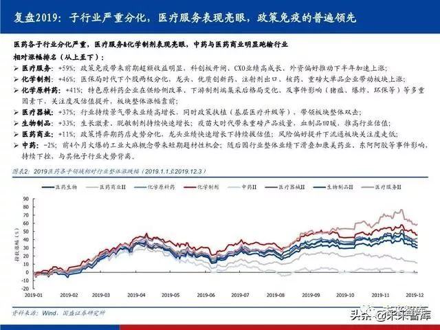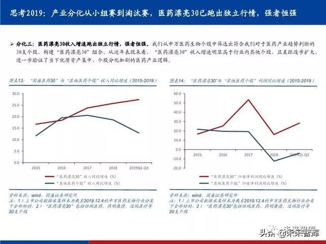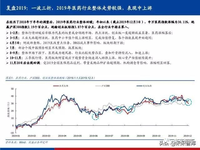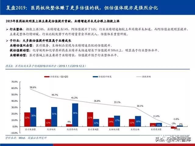 总体上来看,2019年医药行业整体走势较强,表现中上游;而各子行业严重分化,政策免疫的普遍领先。从涨幅拆分来看,指数上涨30%,业绩增速为14%, PE估值提升了16%,医药板块更多的是赚了估值的钱,体现到个股上分化更为明显。从细分领域来看,高景气细分领域表现强势,产业趋势下硬核资产估 值重塑;最后,落实到个股上来看,“硬核硬度决定极度分化”是核心关键词,市值大小已经不是医药板块的最关键因素!
