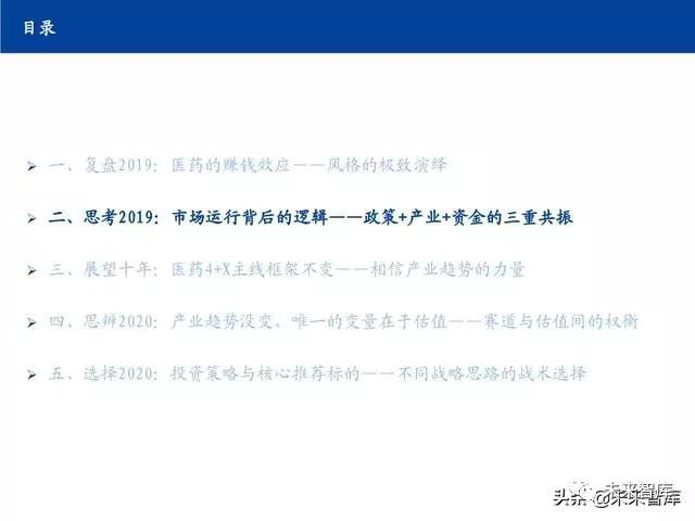 思考2019年医药板块走势背后的逻辑,医药行业的政策环境、产业趋势、资金偏好三大因素的共振引发了医药硬核资产的估值重塑: