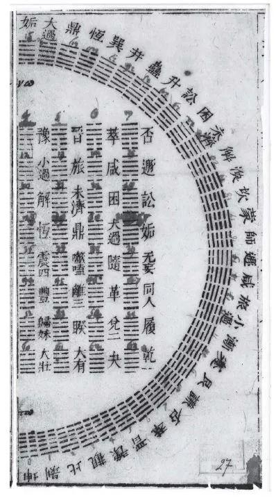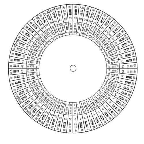 这里不妨提醒一下,颐卦无论是从下至上看还是自上而下来看,在圆图里它的卦象无论从圆心向外看还是从圆周向内看,排序均为33。这样卦象结构对称的还有7个卦,卦序也始终如一:大过30;坤卦0、乾卦63;坎卦18、离卦45;中孚51、小过12。