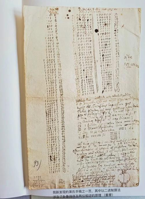 德国数理哲学大师莱布尼兹的二进制算法开启了我们现今所处的伟大信息时代。其学理和千百年前的《易经》有异曲同工之处,“莱布尼茨二进制来源于中国易经”的说法广为流传。加州州立大学(荣休)教授孙涤博士于十一月中旬应邀拜访了莱布尼茨档案馆,目的是要发掘易经和二进制算法两者究竟有着怎样的交互影响。通过仔细研究莱布尼兹和当年在华传教人员(主要是白晋)的来往书信原稿,孙教授发现,易经的智慧对于莱氏开创的二进制算法的确有过强有力的推动,这是华夏古文明对人类文明的一个贡献,我们足堪引以为傲的。其中的一个证据,是白晋在华深入专研易经多年,从中得到不少领悟,他的易经诠释对莱氏的二进制探索有重大的帮助。
