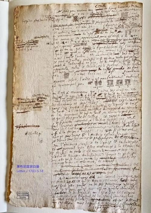 这个愿望在好友⑩的帮助下终于得偿,使我可以亲临汉诺威审阅莱氏的原档。我在十月初接到莱氏档案馆的回复邀请,其时我正在罗马访查耶稣会于明末清初在中国传教的经历,?无法即刻分身前往,因此请求延期至十一月再去。其间我又仔细研读了这批信件,并厘清问题,列成了表格提交给档案馆的专家,请其帮助配合。鉴于我的研究目标集中在易卦排序和二进制算法的联系,故认定这批15封信里的第7-11封,以及第14封信,涵盖较详细的相关内容,深入涉及到对易经的介绍和辨析,以及展开了对二进制算法的讨论,因此格外重要。?档案馆的专家们十分支持,尽职准备并提供原档文件,倾囊相授,令我“得窥全豹”,感到十分的欣慰。在此对他们的厚道相助和严谨的专业精神再表谢忱。?本次访问研究虽然不过数天,却是收获颇丰,待整理后将写入我的论文和书,以解答我们一直以来关切的问题,检验或证实我已经取得一些答案。?本文作为简记,仅提出两个例证,来佐证此行的意义。