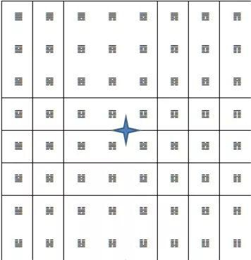 从圆图看,每一条经过圆心的直径所联接的两个卦是一对错卦,除了上述的8对卦在周易原来就成对卦的(占四分之一),其他24对都不是。每对错卦的二进制编号卦序相加均为63。在方图部分,这个关系也非常清晰,每对错卦悉以方图的中心(两条对角线的交点)成中心对称,卦序之和也必为63。这种漂亮的工整对称性揭示出了易学的深邃智慧(千年之前北宋的邵雍就已洞悉,并谨慎披露了出来)。
