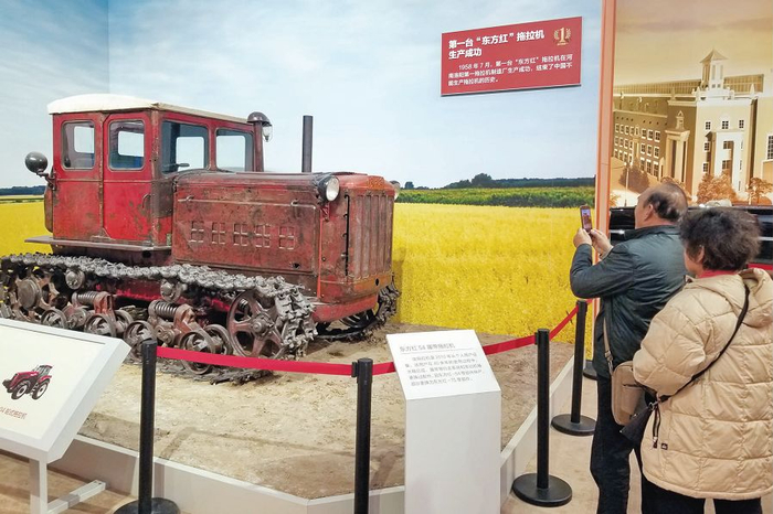 如今,走进正在北京展览馆举办的“伟大历程 辉煌成就——庆祝中华人民共和国成立70周年大型成就展”,你会看到一台当年生产的“东方红”拖拉机。虽然它早已锈迹斑斑,没有了往日的光鲜,但它方正威武的外形、全身通红的颜色、宽大厚重的履带,还是能勾起许多人的回忆,仿佛看到它轰鸣着行走在广袤的田野上辛勤耕作。