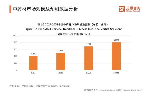 数据显示,中国中药材市场规模2017年为1018亿元,2018年达到近1246亿元,预计2022年将达到1708亿元,2024年将超过2000亿元,年平均复合增长近10%。艾媒咨询分析师认为,在国家一系列扶持政策驱动下,中药材的战略地位逐步凸显,中药材产业不断发展壮大,中药材市场规模扩大前景可观。