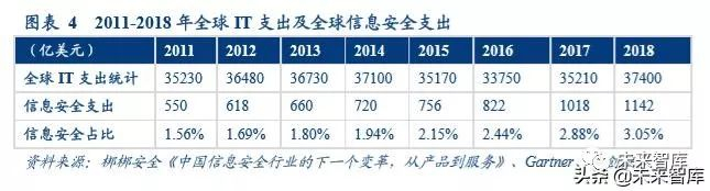 我国网络安全渗透率较低:与全球市场比,我国网络安全支出比例仍低,市场潜力巨大。根据 Gartner 对 2011 年到 2018 年全球 IT 支出及全球信息安全支出所做统计来看,信息安全支出占整个 IT 支出的比例越来越高,2018 年全球 信息安全支出占 IT 支出的比例为 3.05%。与之对比,Gartner 数据显示,中国在 2019 年的 IT 支出约将达到 2.9 万亿元 规模,而信息安全市场规模为 500 亿元左右,中国信息安全支出占 IT 支出比例仅为 1.7%,相对于全球平均水平还 有较大差距。假设中国信息安全支出比例达到全球平均水平 3%,所对应的网络安全市场规模将达近千亿量级。
