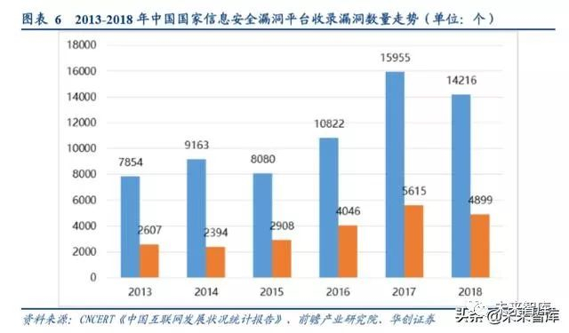 高危漏洞层出不穷,如英特尔处理器“Meltdown”和“Spectre”新型漏洞、ThinkPHP 漏洞、移动支付 SDK 漏洞、 思科漏洞等。根据历年发布的《中国互联网发展状况统计报告》数据显示,2013-2018 年我国信息安全漏洞平台收录 漏洞数量逐年增加,2018 年漏洞数量达到 14216 个,其中高温漏洞数量达 4899 个,占全部安全漏洞数量的占比高 达 34.5%。