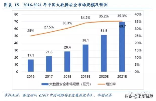 受政策和各类数据泄密事件影响,中国大数据市场规模快速上升。大数据安全是用以搭建大数据平台所需的安全产 品和服务, 以及大数据场景下围绕数据安全展开的大数据全生命周期的安全防护。大数据安全主要包括大数据平台 安全、大数据安全防护和大数据隐私保护,产品主要包含大数据系统安全产品、大数据资源发现、大数据管理运营、 敏感数据梳理、大数据脱敏、应用数据审计、大数据审计等。2018 年的总规模达到了 28.4 亿元,随着大数据安全市 场的成熟,年均增长率预计将逐步提高。