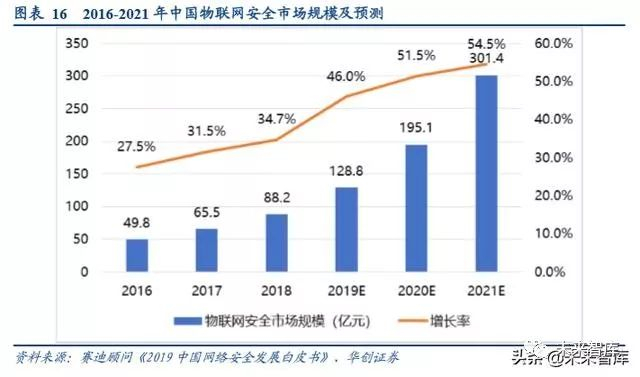 伴随物联网市场规模的快速增长,物联网设备、网络、应用也面临严峻的安全挑战。物联网安全将成为万亿规模市 场下的蓝海“潜力股”,根据赛迪顾问《2019 中国网络安全发展白皮书》统计数据,2018 年,我国物联网安全市场 规模达到 88.2 亿元,增速达到 34.7%,预计到 2021 年,物联网安全市场规模将达到 301.4 亿元。