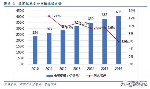 美国已形成较为完整的安全战略体系。1)政策层面,美国先后颁布《网络空间政策评估》、《网络空间国际战略》、《网络空间行动战略》等一系列政策性文件,从技术层面、资源层面、信息层面到法理层面抢占全球网络空间制网 权和制高点。2)产业层面,国防承包商、基础安全产业和 IT 安全产业中的龙头已经较为固定,同时在政府的保护 下,也为创业和创新型中小企业提供了较大的生存空间。美国安全市场主要包括三类企业:一是拥有掌控核心技术 的基础安全产业,如思科、微软、甲骨文、英特尔、苹果、谷歌等一系列掌控着核心技术的产业巨头,二是形成了 综合解决网络安全问题的 IT 安全产业,涵盖了赛门铁克、趋势、飞塔等综合性网络安全企业,及 FireEye、Palantir 等具体领域的专业化企业;三是具有超强整合能力的网络安全承包商。如波音、洛马等。截至 2016 年,美国网络安 全市场规模超过 400 亿美元,进入平稳增长阶段。