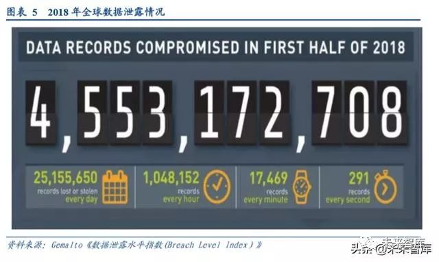 信息泄露规模连年加剧。信息泄露事件依然频繁,涉及各行各业,大到全球化公司、大型互联网企业,小到城市医保系统,如已公开的 12306 网站、医疗行业患者信息、A 站、顺丰快递、华住酒店、万豪酒店、陌陌等。根据 Gemalto 发布的《数据泄露水平指数(Breach Level Index)》,仅 2018 年上半年,全球就发生了 945 起较大型的数据泄露事 件,共计导致 45 亿条数据泄露,与 2017 年相比数量增加了 133%,是 2017 年全年报告数量 20 亿的两倍多。例如, 2018 年 11 月,万豪国际集团公布其酒店数据泄露事件,涉及约 5 亿客人的个人信息和开房记录。