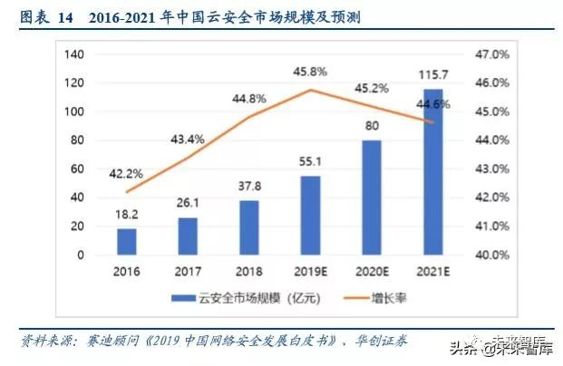 云计算的进步将引发新的网络信息安全问题,驱动云安全市场的高速增长。随着云端数据体量不断增长,企业用户 对云计算的需求亦越来越多样化,衍生出了多种云计算应用场景和云服务模式。网络技术协同融合意味着安全风险 的交织与演变,例如“云计算+物联网”在有效提升万物互联时代信息处理效率的同时,物联网设备端安全漏洞亦成 为黑客反向攻击云平台,进行数据窃取与破坏的突破口;与此同时,云计算的进步带动无服务器计算发展,亦将引 发新的网络信息安全问题。攻击者更容易借无服务器计算隐藏活动踪迹制造网络威胁。这些都成为云计算发展过程 中带来的网络信息安全威胁,同时也为未来云安全产品与服务的研发与部署提供了广阔的应用场景。中国云安全市 场目前仍处于起步阶段,整体的市场规模将随着云计算市场规模的增长而快速崛起。2018 年,中国云安全市场规模 达到 37.8 亿元,增长率达 44.8%,未来 3 年内预计仍将保持每年 40%的高速增长。