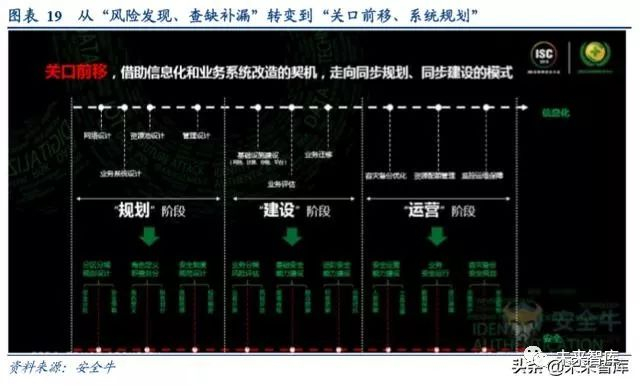 二是防护思想改变,从“风险发现、查缺补漏”转变到“关口前移、系统规划”。新一轮的信息化大潮中,不仅是 大数据为核心的应用和数据的变化,网络、云计算等基础设施都发生了变化,“创可贴”已经无法真正有效保护信 息系统的安全,“安全嵌入”需求更加迫切,安全企业需要跟集成商、研究院、设计院在一起,在信息化和信息化 改造的初期把安全规划做进去,基于动态综合防御体系进行规划,实现信息化和安全同步规划、同步建设和同步运 营。