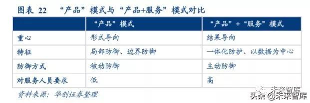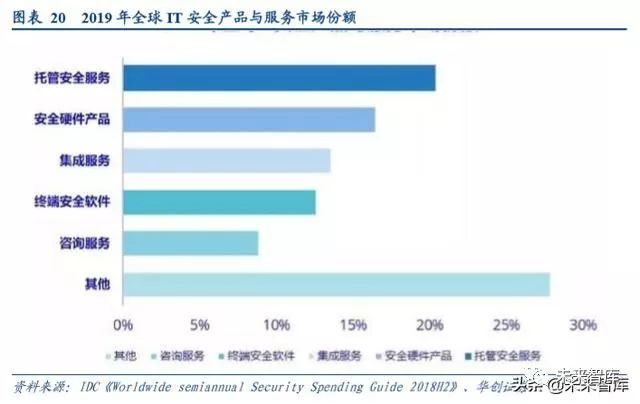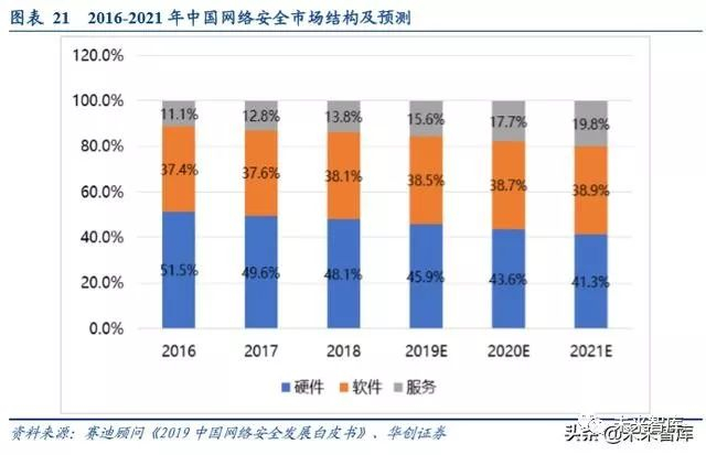 中国的网络安全市场起步较晚,且安全服务市场还处于萌芽发展阶段。网络安全硬件产品仍占据接近一半市场份额, 软件产品市场规模逐年增长,但服务占比仍然较低,2018 年仅为 13.8%, 远低于发达国家水平。究其原因,由于信 息安全行业的产品线众多,大到集团公司小到部门,都可能需要针单个产品进行单独招标,并且为了防止一家独大, 往往出现刻意分散招标的情况,而由于分散招标,很难形成各种网安产品的立体联动防御和大数据分析,信息安全 公司也很难提供有效的整体安全服务。